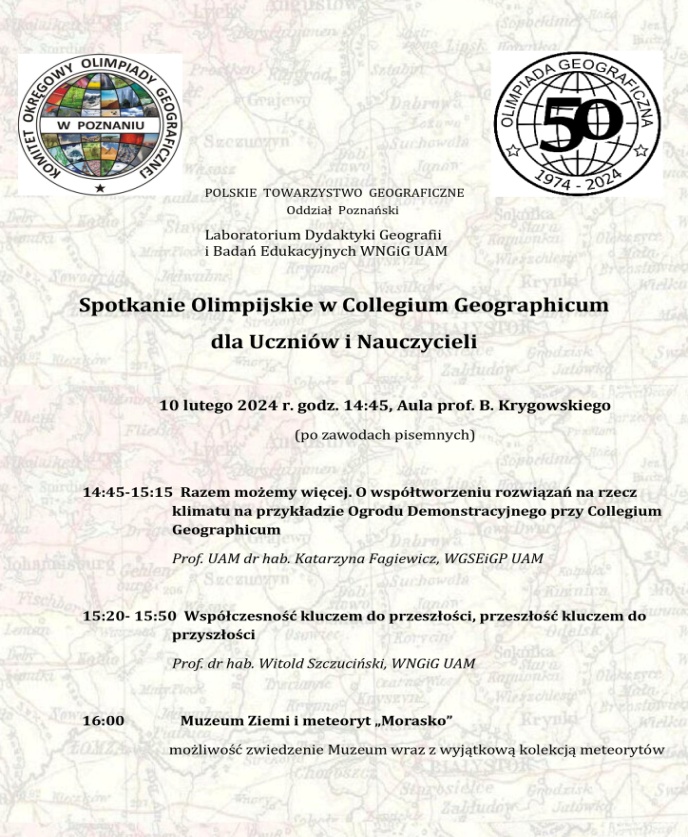 W dniach 10 i 11 lutego 2024 r. w Collegium Geographicum UAM w Poznaniu odbyły się okręgowe zawody II stopnia 50. Olimpiady Geograficznej.