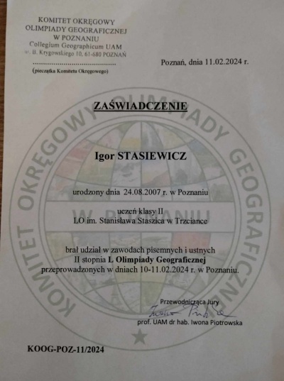 Bardzo dużą wiedzą i umiejętnościami z zakresu geografii wykazał się Mikołaj Wieloch, ale do awansu do części ustnej zabrakło mu kilku punktów. Fantastycznie poradził sobie Igor Stasiewicz, który był jednym z 18 uczniów, którzy zakwalifikowali się do niedzielnego ścisłego finału.